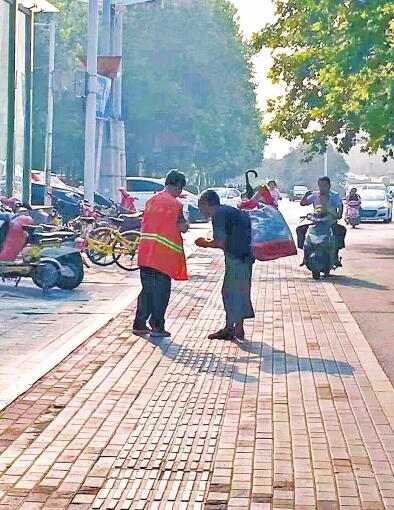 發(fā)生在鄭州金水路街頭的這一幕,剛好被市民拍到。昨日在網(wǎng)絡(luò)上發(fā)布后,感動(dòng)了很多網(wǎng)友。62歲的女環(huán)衛(wèi)工事后說:“這是應(yīng)該的,是小事,不值得宣傳?!备浇熳R(shí)她的人說,這名環(huán)衛(wèi)工是個(gè)熱心腸,之前已經(jīng)多次給流浪人員買飯、送水、送餐。