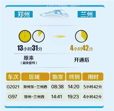 據(jù)鄭州東站工作人員介紹,即日起鄭州東站每天將有18趟往返蘭州的高鐵列車(具體列車車次、開行日期以12306網(wǎng)站以及車站公告為主),其中始發(fā)高鐵列車3趟。鄭州到蘭州最快的車次為G97,從鄭州車站至蘭州西站,中間經(jīng)停西安北、天水南站,全程僅需4小時(shí)42分。這較之前最快的Z265次列車足足縮短了將近8個小時(shí)。