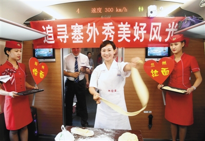 為了慶祝首發(fā),李惠萍帶領(lǐng)幾名高姐,策劃了各種小環(huán)節(jié)來和旅客互動,現(xiàn)場做燴面、拉牛肉面,整個車廂熱熱鬧鬧。