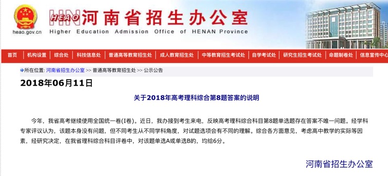 近日,河南省招生辦公室接到考生來(lái)電,反映高考理科綜合科目第8題單選題存在答案不唯一問(wèn)題。經(jīng)學(xué)科專家評(píng)議認(rèn)為,該題本身沒(méi)有問(wèn)題,但不同考生從不同學(xué)科角度,對(duì)試題選項(xiàng)會(huì)有不同的理解。