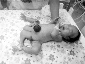 四腿寶寶的肚臍膨出,如一個深色的肉球,長有四條腿和兩個生殖器,其中外面的兩條腿發(fā)育比較好。