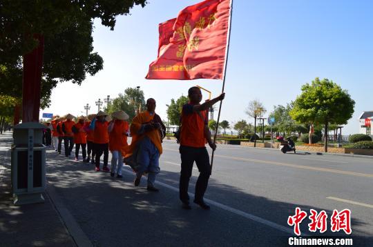 圖為朝圣團(tuán)一行30人在少林寺延偵法師、延宗法師的帶領(lǐng)下,徒步行腳。 少林寺供圖 攝圖為朝圣團(tuán)一行30人在少林寺延偵法師、延宗法師的帶領(lǐng)下,徒步行腳。 少林寺供圖 攝