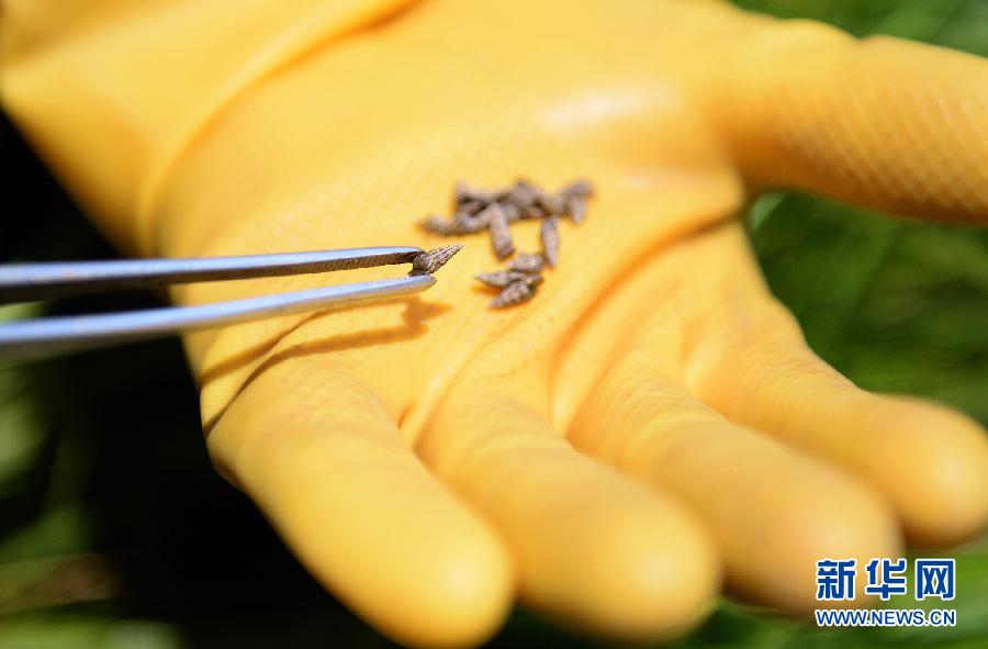 滅螺隊(duì)員在查看收集到的釘螺(4月14日攝)。 新華社記者 萬(wàn)象 攝