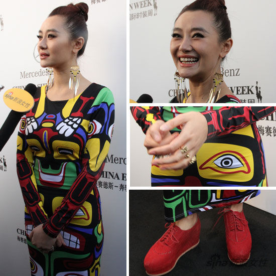 中國(guó)國(guó)際時(shí)裝周啟動(dòng)儀式,愛戴一襲民族風(fēng)緊身長(zhǎng)裙秀纖細(xì)小蠻腰,搭配了大紅色的休閑鞋,梳起了俏皮的丸子頭,在配上流蘇項(xiàng)鏈和金屬朋克風(fēng)的戒指首飾,整身表達(dá)了周末輕松愉悅的心情,同時(shí)花花綠綠的出街,又很吸引人眼球。