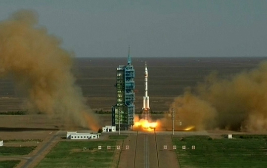 中新網酒泉中國載人航天發(fā)射場6月11日電 北京時間6月11日17時38分許,長征二號F遙十運載火箭在酒泉衛(wèi)星發(fā)射中心中國載人航天發(fā)射場順利點火起飛,將神舟十號載人飛船發(fā)射升空。