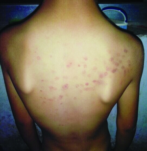 10月8日,謝女士在給小韋洗澡時(shí),發(fā)現(xiàn)孩子的后背上都是紅斑,像是被什么硬東西戳傷的。從謝女士提供的照片可以看到,小韋的后背上是成片的紅斑,記者粗略地?cái)?shù)了一下,紅斑超過50個?!爱?dāng)時(shí)我問他是怎么搞的,孩子也不說,我以為是在學(xué)校玩摔倒弄的,就沒再追問。”