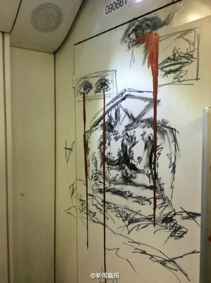 本整潔的地鐵車廂內(nèi)壁,被畫上了“半裸人體”的涂鴉,還用紅色顏料配上了酷似流血的圖案,看起來頗觸目驚心。