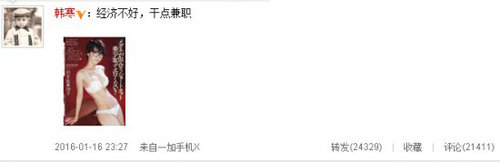 1月16日晚,韓寒在微博曬出一張與自己撞臉的女優(yōu)的照片,并寫道:“經(jīng)濟不好,干點兼職。”