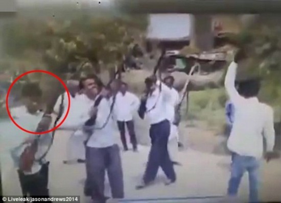 印度一對(duì)幸福新人26日于中央邦巴德納加爾舉行婚禮,賓客鳴槍慶祝時(shí)卻不慎誤射新郎父親,讓38歲的派特爾當(dāng)場(chǎng)倒地身亡。左一為鳴槍賓客,右一為受害者。