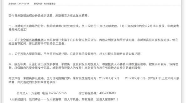上述公告發(fā)布之后引起了投資者和員工的強烈不滿,于是來財街官網(wǎng)數(shù)小時后又發(fā)布了聲明,強調(diào)“來財街并無跑路的行為,相關(guān)結(jié)算都已經(jīng)處理完成,員工12月份工資已足額發(fā)放,1月工資按照合約會在2月15日發(fā)放,年終獎也并無拖欠員工!”