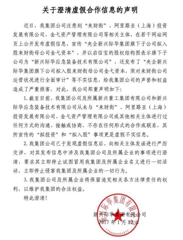 對于這一“抱大腿”的行為,新興際華1月22日在其官網(wǎng)發(fā)布《關(guān)于澄清虛假合作信息的聲明》,稱“央企新興際華集團旗下公司擬入股金戈資本,須對來財街公司運營狀況進行全面審計”為不實信息,并聲明新興際華及其所屬新興重工集團有限公司、新興際華應(yīng)急裝備技術(shù)有限公司從未與來財街、阿里路亞(上海)投資發(fā)展有限公司、金戈資產(chǎn)管理有限公司進行過任何方式的溝通、接觸或協(xié)商,不存在任何形式的合作或聯(lián)系。
