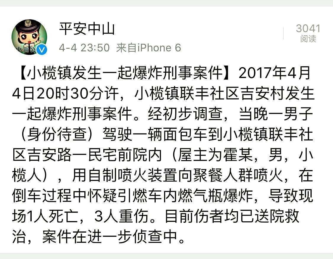 2017年4月4日20時(shí)30分許,小欖鎮(zhèn)聯(lián)豐社區(qū)吉安村發(fā)生一起爆炸刑事案件。經(jīng)初步調(diào)查,當(dāng)晚一男子(身份待查)駕駛一輛面包車到小欖鎮(zhèn)聯(lián)豐社區(qū)吉安路一民宅前院內(nèi)(屋主為霍某,男,小欖人),用自制噴火裝置向聚餐人群噴火,在倒車過程中懷疑引燃車內(nèi)燃?xì)馄勘ǎ瑢?dǎo)致現(xiàn)場1人死亡,3人重傷。