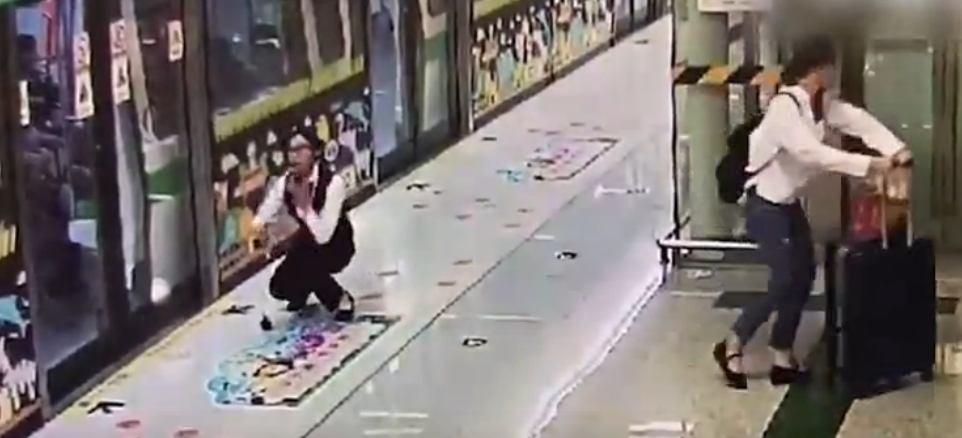 這一舉動十足嚇了現(xiàn)場工作人員一跳,女子隨后不知什么原因,地鐵也不坐就離開了。