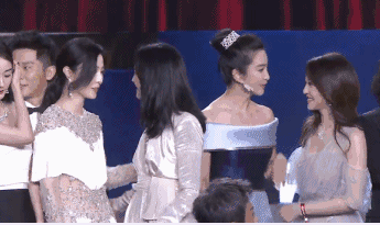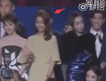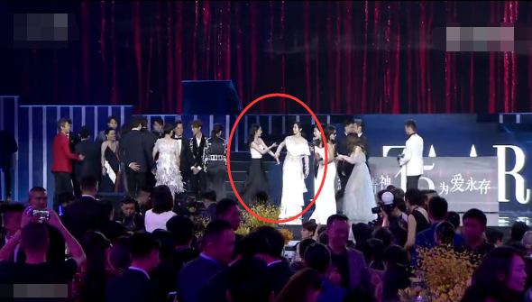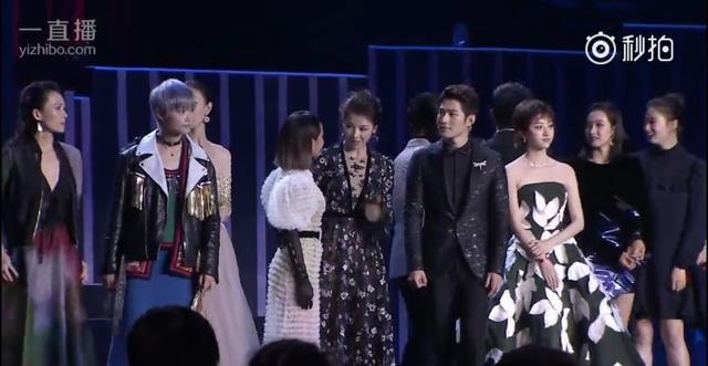 后來(lái)黃曉明隊(duì)和吳秀波隊(duì)的人一上來(lái),舞臺(tái)上就滿(mǎn)了,而張韶涵的位置從劉嘉玲的右邊換到了劉嘉玲左邊,變成在李冰冰和劉嘉玲中間??梢钥吹剿?dāng)時(shí)也還是挺尷尬的。然后李冰冰和張韶涵身邊的劉嘉玲握手寒暄,張韶涵尷尬的站在原地。