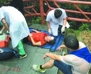 醫(yī)護(hù)人員在半山處對(duì)傷者進(jìn)行救治。廣州日?qǐng)?bào) 圖