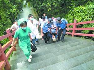 盧先生繼續(xù)攙扶著妻子往山下走。當(dāng)他們走到離山腳還有900米時(shí),遇到了兩名前來(lái)施救的輔警,兩人在兩名輔警的攙扶下,繼續(xù)慢慢向山下走去。走到離山腳約600米距離時(shí),120急救人員、景區(qū)工作人員及兩名輔警也趕來(lái)了。醫(yī)護(hù)人員對(duì)他們進(jìn)行了檢查和包扎后把王女士抬上擔(dān)架。王女士一邊輸液一邊被抬下山。40分鐘后,終于到達(dá)山下,王女士被送往醫(yī)院救治。