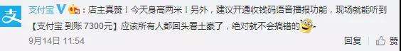 對此,支付寶官方表示,建議開通收錢碼語音播報功能,現(xiàn)場就能聽到“支付寶到賬7300元”,應(yīng)該所有人都回頭看土豪了,絕對就不會搞錯的。