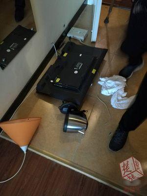 無(wú)奈,酒店工作人員只好用樓層房卡將6038號(hào)房打開(kāi)。打開(kāi)門(mén),眾人驚呆了!一個(gè)沒(méi)穿上衣的小伙子正在玩手機(jī),房?jī)?nèi)的電話機(jī)、電水壺、臺(tái)燈、電視機(jī)都被砸了,甚至連床板都拆了……