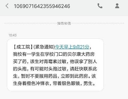 15日上午10時(shí)03分,成都工業(yè)學(xué)院接到了校門口一藥房的求助:一名戴銀色眼鏡,身著橙色沖鋒衣的學(xué)生在結(jié)賬時(shí)誤拿了別人頭孢藥,因其告訴工作人員對(duì)青霉素過(guò)敏,如服用將可能產(chǎn)生嚴(yán)重后果。