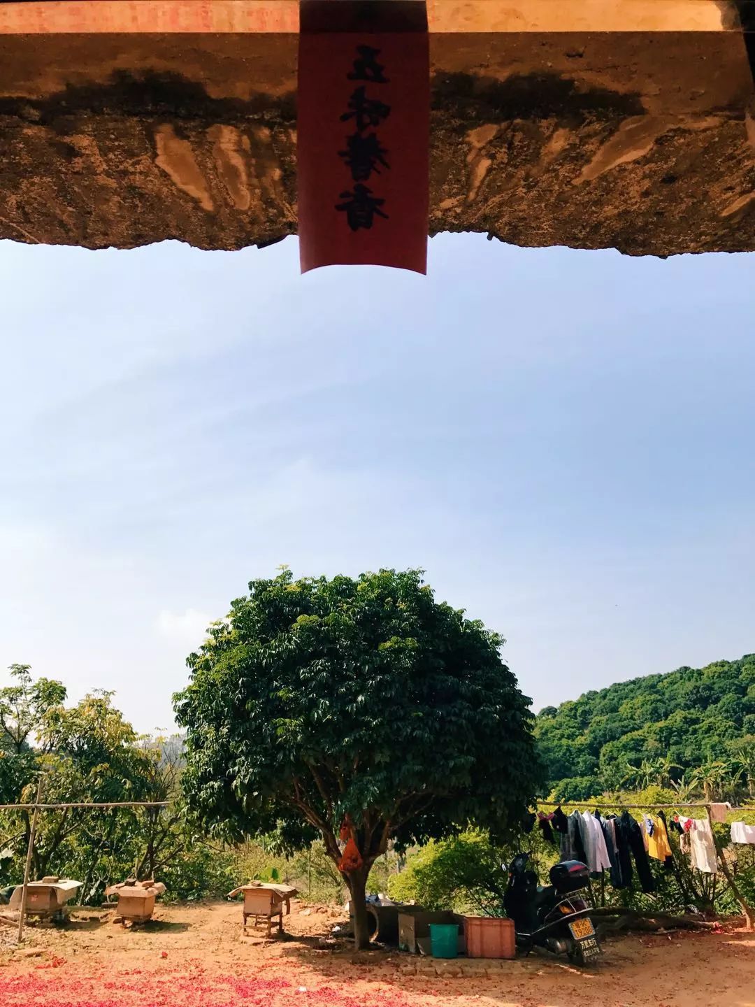 初一那天在爐灶燒柴時,抬頭看到了二伯種的黃皮樹,三伯養(yǎng)的蜜蜂,一旁晾曬的衣服,出行的摩托,還有散落滿地的鞭炮殘渣……對了,還有屋頂貼的“五味馨香”,突然覺得,這一片家園就是心中最好的世外桃源。