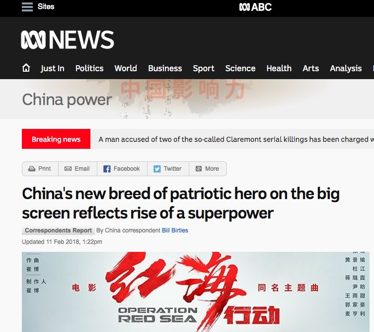 澳大利亞廣播公司新聞網(wǎng)分析稱,中國大銀幕上的新型愛國英雄反映了一個(gè)超級(jí)大國的崛起。作為中國強(qiáng)大外交自信在電影領(lǐng)域的展現(xiàn),銀幕英雄將會(huì)越來越多的揮舞著中國旗幟。