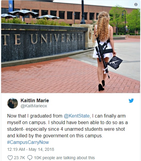 報道稱,凱特琳·班內(nèi)特畢業(yè)于位于俄亥俄州的州立肯特大學,取得了生物學學位。畢業(yè)后的第二天,這名22歲的女孩返回校園,肩背一把AR-10半自動步槍,手拿頂上印有“有膽來拿”字樣(美國獨立戰(zhàn)爭的口號)的畢業(yè)帽,還拍了照并發(fā)到了網(wǎng)上。