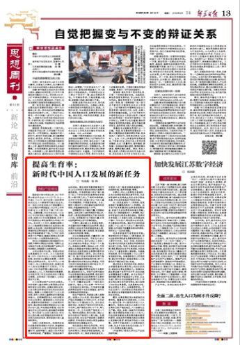 8月14日,江蘇省委機(jī)關(guān)報(bào)《新華日?qǐng)?bào)》在第13版“思想周刊·智庫”欄目刊發(fā)了劉志彪、張曄聯(lián)合撰寫的題為《提高生育率:新時(shí)代中國人口發(fā)展的新任務(wù)》的署名文章。