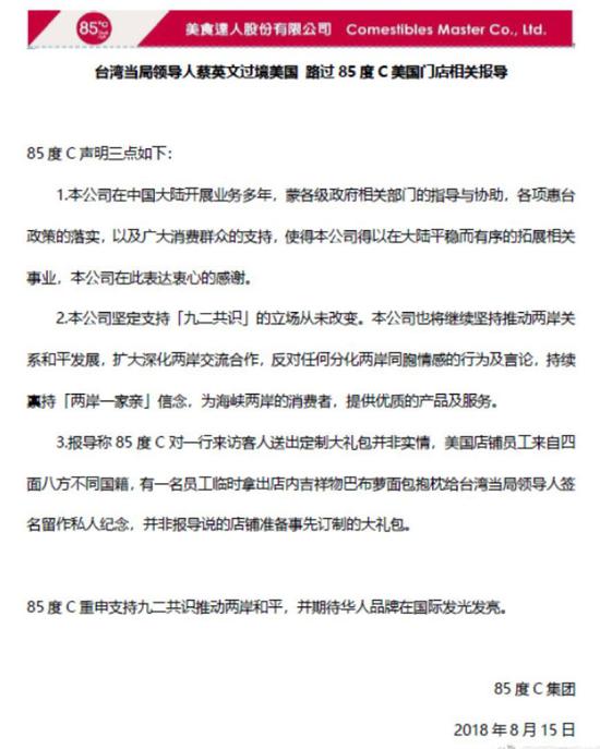 目前,針對(duì)蔡英文“訪問”其美國(guó)店面而引起了強(qiáng)烈輿論風(fēng)波,“85度C”剛剛在其開設(shè)在大陸微博和微信平臺(tái)的賬號(hào)上發(fā)布了一則聲明,強(qiáng)調(diào)其支持“九二共識(shí)”和“反對(duì)任何分化兩岸同胞情感的行為及言論”。