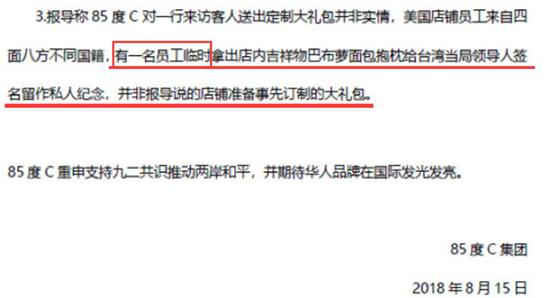 其次,有大陸網(wǎng)友還發(fā)現(xiàn)“85度C”的聲明中有將一切責(zé)任推給“臨時(shí)工”的嫌疑,并回避了導(dǎo)致這場(chǎng)風(fēng)波的“源頭”恰恰是跑到美國(guó)為臺(tái)獨(dú)“造勢(shì)”的蔡英文。