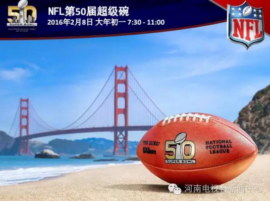 全美收視率最高的電視節(jié)目,全球最具商業(yè)價(jià)值的體育賽事,被稱(chēng)為“美國(guó)春晚”的超級(jí)碗來(lái)了! 2月8日農(nóng)歷大年初一上午7:00到11:00,河南電視臺(tái)新聞?lì)l道全球同步直播第50屆美國(guó)職業(yè)橄欖球年度冠軍總決賽,敬請(qǐng)收看。