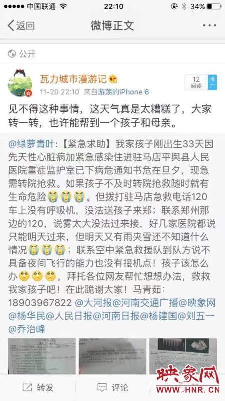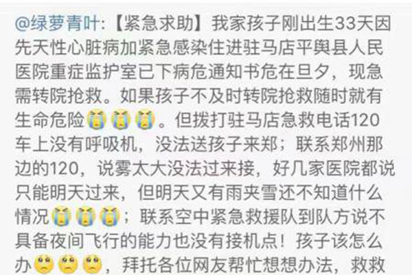 11月20日晚,一條微博牽動著無數(shù)人的心。駐馬店平輿縣一個剛剛出生33天的嬰兒因先天性心臟病加緊急感染被駐馬店市平輿縣人民醫(yī)院下達了病危通知書,但當(dāng)?shù)蒯t(yī)療條件有限,患兒無法得到及時有效的治療,急需轉(zhuǎn)院治療,但聯(lián)系的鄭州醫(yī)院因為天氣原因無法前往。