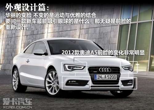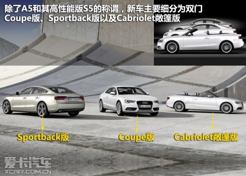 2012款奧迪A5屬于中期改款車型,在外觀、內(nèi)飾、動力和底盤上都有較為明顯的變化。除了A5和其高性能版S5的稱謂,新車主要細(xì)分為雙門Coupe版、Sportback版以及Cabriolet敞篷版。
