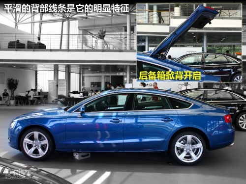 5月23日,奧迪A5/S5全系共10款車型正式在全國上市,其中包括全新的A5/S5 Cabriolet敞篷轎跑車、A5/S5 Sportback五門轎跑車和全新的A5/S5 Coupe雙門轎跑車,以及充滿動感個性的A5 Coupe 2.0T風尚版。今天我們在4S店拍攝到的這輛藍色的A5為售價52.8萬的Sportback 2.0T車型。