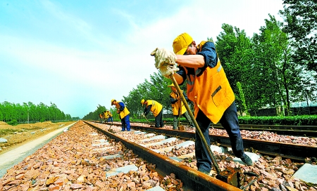 4月27日,我省鐵路工人正在山西中南部鐵路大通道河南濮陽段施工現(xiàn)場,對剛鋪設(shè)的道軌進(jìn)行修整。該鐵路大通道濮陽段自開工以來已完成投資31.68億元,完成路基土石方889.89萬方、橋梁21026米、涵洞5802米、鋪軌166公里。該鐵路建成通車后將成為我國第一條真正意義上的重載鐵路。高 林 劉榮莉 攝