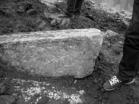 昨日上午,記者來(lái)到發(fā)現(xiàn)古墓的施工現(xiàn)場(chǎng),南陽(yáng)市文物考古研究所考古人員已經(jīng)進(jìn)駐該工地,著手發(fā)掘工作。這座古墓位于該市臥龍路與車(chē)站路交叉口南側(cè)約700米處,4塊大小不一、形狀各異的大青石散落在工地中央,其中兩塊仍半掩在泥土中,依稀能看到上面刻有圖案(如圖),現(xiàn)場(chǎng)還有不少灰色磚塊。