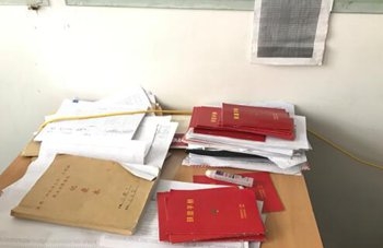 (曹紅彥的辦公桌上,擺滿了扶貧手冊和村民資料)