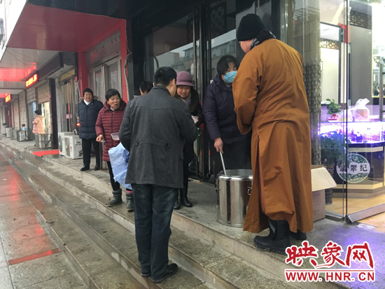 5日早上7點雖然下著小雨,滎陽市康泰路于廣武路交叉口西約100米路北,一家“翡翠紀(jì)”的店門口前卻是熱鬧非凡,一名身著僧服的僧人正在給過往市民從保溫桶里盛出熱氣騰騰的臘八粥。商家老板,上學(xué)學(xué)生,環(huán)衛(wèi)工人等紛紛來到門前,端著臘八粥喝了起來。