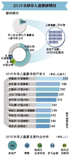 從行業(yè)分布看,華人富豪前十中,房地產(chǎn)巨頭依然占據(jù)最多席位。此外,2015年上榜的370位華人富豪中,房地產(chǎn)依舊牢牢占據(jù)著第一的位置,有80位、超過20%的華人富豪涉足房地產(chǎn)行業(yè)。其中,大連萬達(dá)集團董事長王健林以凈資產(chǎn)242億美元躋身前三,也是大陸富豪第一位。(記者 梁薇薇)