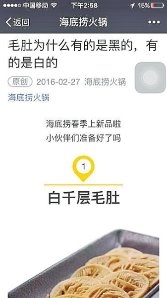 海底撈官方微信對自家的白毛肚不吝溢美之詞