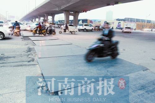 昨天下午,記者在現(xiàn)場看到,隴海高架橋黃河南路(西向東方向)下橋口南北兩側,20余塊鋼板一字鋪開,鋼板路長約50米、寬約2米,車輛經(jīng)過時,鋼板與路面不斷發(fā)出沉悶的撞擊聲。