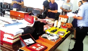 在警方展示贓物的現(xiàn)場(chǎng),各種玉石、陶瓷、珠寶、金表、類似兵馬俑的古董、冬蟲夏草、古書、紀(jì)念幣、郵票、筆記本電腦、平板電腦等滿滿一桌子物品著實(shí)讓人看得眼花繚亂。