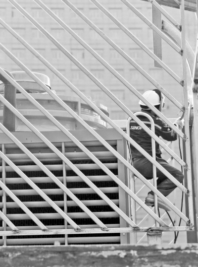 高溫之下,工人師傅正在進(jìn)站口處抓緊施工。