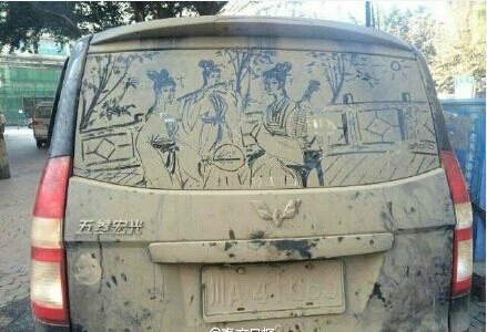網(wǎng)友在成都偶遇一臟不溜秋的面包車!走近一看,后檔風(fēng)玻璃上畫了一副美女圖,惟妙惟肖!~你只覺得我沒錢洗車,卻不知道我也有一顆藝術(shù)的心~~只是朋友,車牌被擋住了,等會兒警察蜀黍過來……