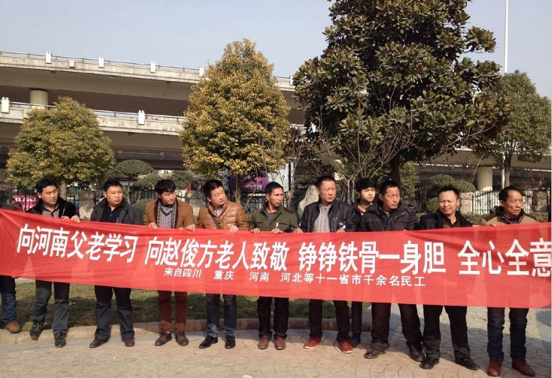 去年11月,濮陽老人趙俊方(2010年“感動(dòng)中國(guó)”候選人)遠(yuǎn)赴山東聊城陽谷,幫13省1000余農(nóng)民工討薪,經(jīng)過近兩個(gè)月努力,要回280萬。為表感謝,1月17日,來自6個(gè)省份的農(nóng)民工兄弟齊聚鄭州,為老人送來錦旗。