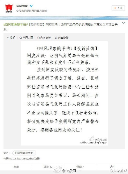 以往不少"性丑聞"官員都被查出貪腐問題。不妨順藤摸瓜,查一查張朝輝是否存在其他問題,給民眾一個交代。同時,張朝輝今年初剛被任命為湯陰縣氣象局長,尚在1年試用期內(nèi)。既然出了如此影響惡劣的丑聞,組織上有必要對其任職資格和條件,重新進行評估。