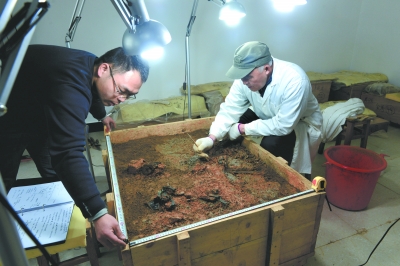徐長青所說的實驗室即文物保護用房,距離南昌西漢?;韬钅共坏?公里。這不到1公里的轉(zhuǎn)運道路,部分為鄉(xiāng)間土路,加之最近接連幾天下雨,道路已 凹凸不平。據(jù)了解,打包好的主棺柩總重量超過4噸,錢箱有2噸多重。如果路面不平,將會給轉(zhuǎn)運帶來不確定因素。為了確保轉(zhuǎn)運當天運輸通暢,避免文物顛簸晃 動,工作人員這幾天運來了大量砂石填平道路。14日上午,整條運輸線上的坑洼路段已全部填平完畢。