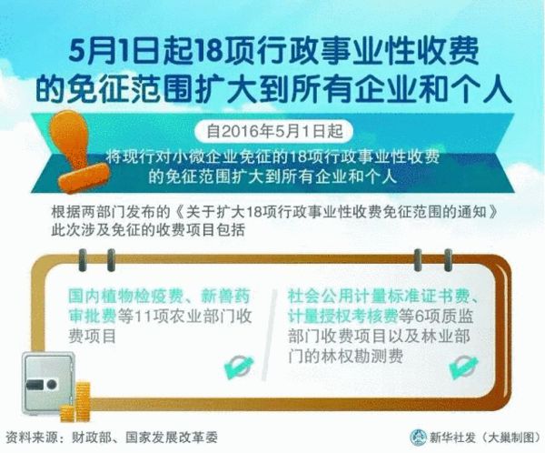通知要求,將現(xiàn)行對(duì)小微企業(yè)免征的18項(xiàng)行政事業(yè)性收費(fèi)的免征范圍擴(kuò)大到所有企業(yè)和個(gè)人。
