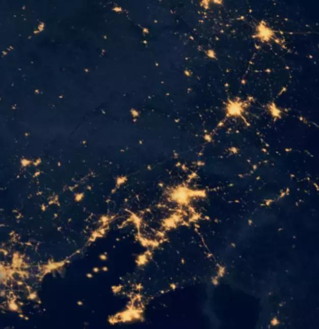 先來看珠三角,珠三角的城市燈光幾乎融為一體,從廣州到深圳再到香港澳門,城市的地理邊界基本消失。