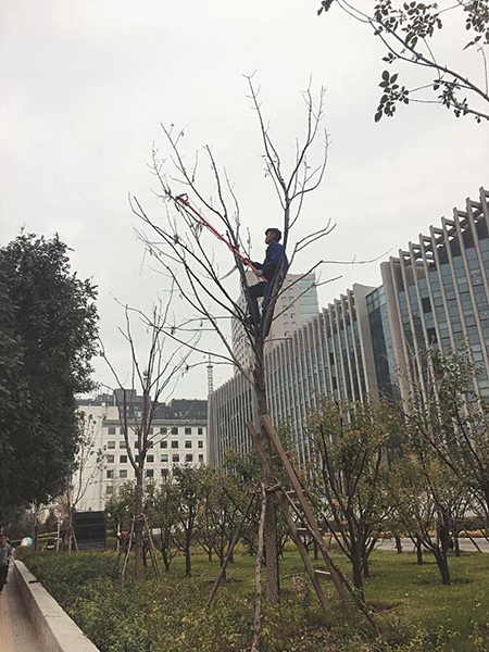 “總有人看見我站在樹上,好奇地打問,我也就和他們多說幾句。沒人看著的時(shí)候,我正好多干一會兒,好把工作早點(diǎn)干完?!崩隙握f,高空剪枝雖然在普通人看來挺危險(xiǎn)的,但是他習(xí)慣了有把握就不覺得有啥難的。如果有人問剪枝的問題,他也愿意解答。
