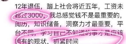 12年退伍,在社會(huì)上5年,工資未超過3000元,但是感覺錢不是最重要的,只是儲(chǔ)備,洞察力才重要,學(xué)習(xí)自己不知道是才是應(yīng)該有的狀態(tài)。